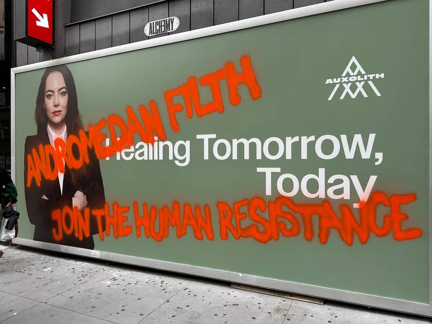 Ahead of the movie’s late-October release, Focus Features, which produced and distributed the film, rolled out three in-world stunts, including a LinkedIn page for the company Auxolith, where main character Michelle Fuller (played by Emma Stone) is CEO; OOH billboards seemingly advertising Fuller and Auxolith that were graffitied over with phrases like “Andromedan filth” and “Join the human resistance”; and a conspiracy theory website, HumanResistanceHQ.com, housing research about “suspected Andromedans.” None of it is real, but for at least a second, anyone coming across these stunts just might believe it could be.